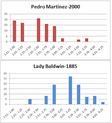 Further, categorizing into buckets of success we can see Martinz is routinely throwing seasons with an RCERA under 3.00 (87 of 100). Baldwin, while great, tossed just 13 seasons with an RCERA in this range.